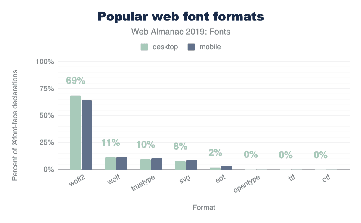 From my perspective, an argument could be made to go WOFF2-only for web fonts after seeing the results here. I wonder where the double-digit WOFF usage is coming from? Perhaps developers still serving web fonts to Internet Explorer?