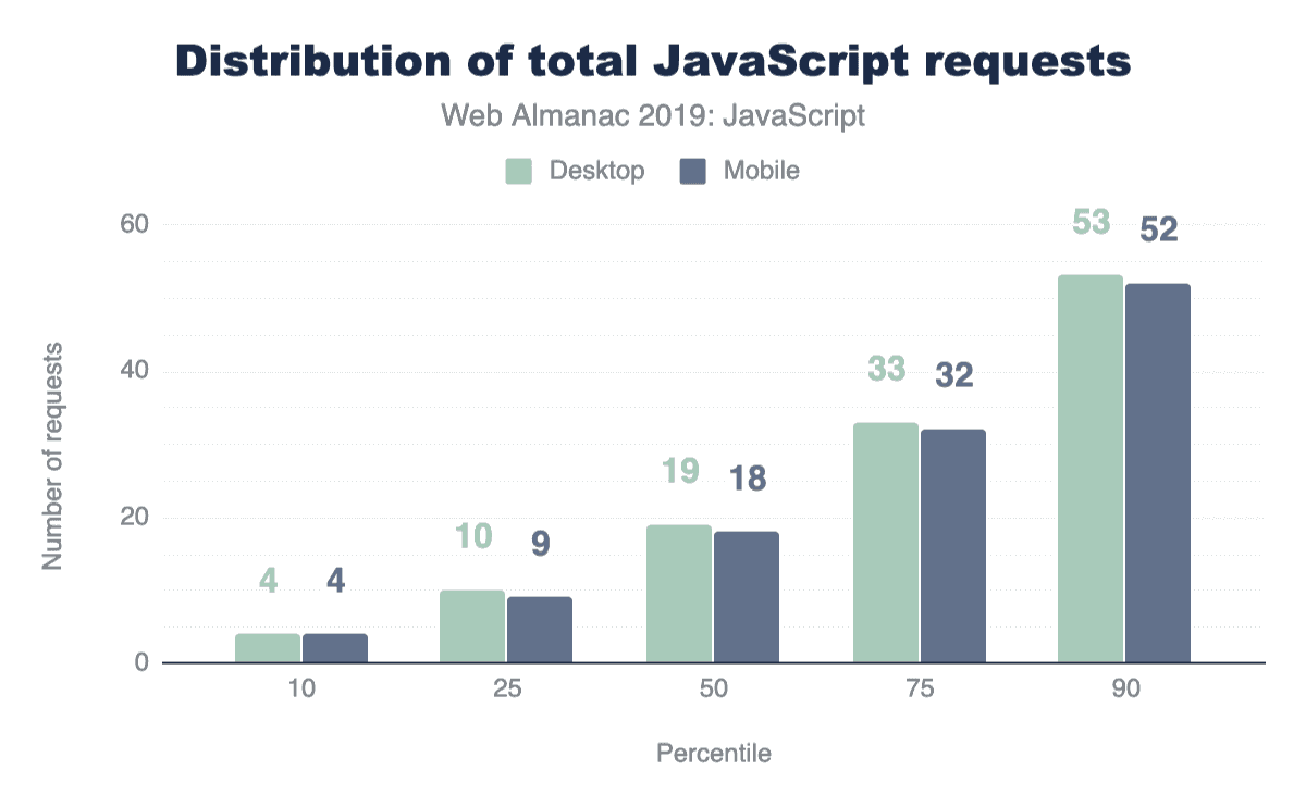 One avenue worth exploring when trying to analyze the amount of JavaScript used by web pages is the number of requests shipped. With HTTP/2, sending multiple smaller chunks can improve page load over sending a larger, monolithic bundle. If we also break it down by device client, how many requests are being fetched?