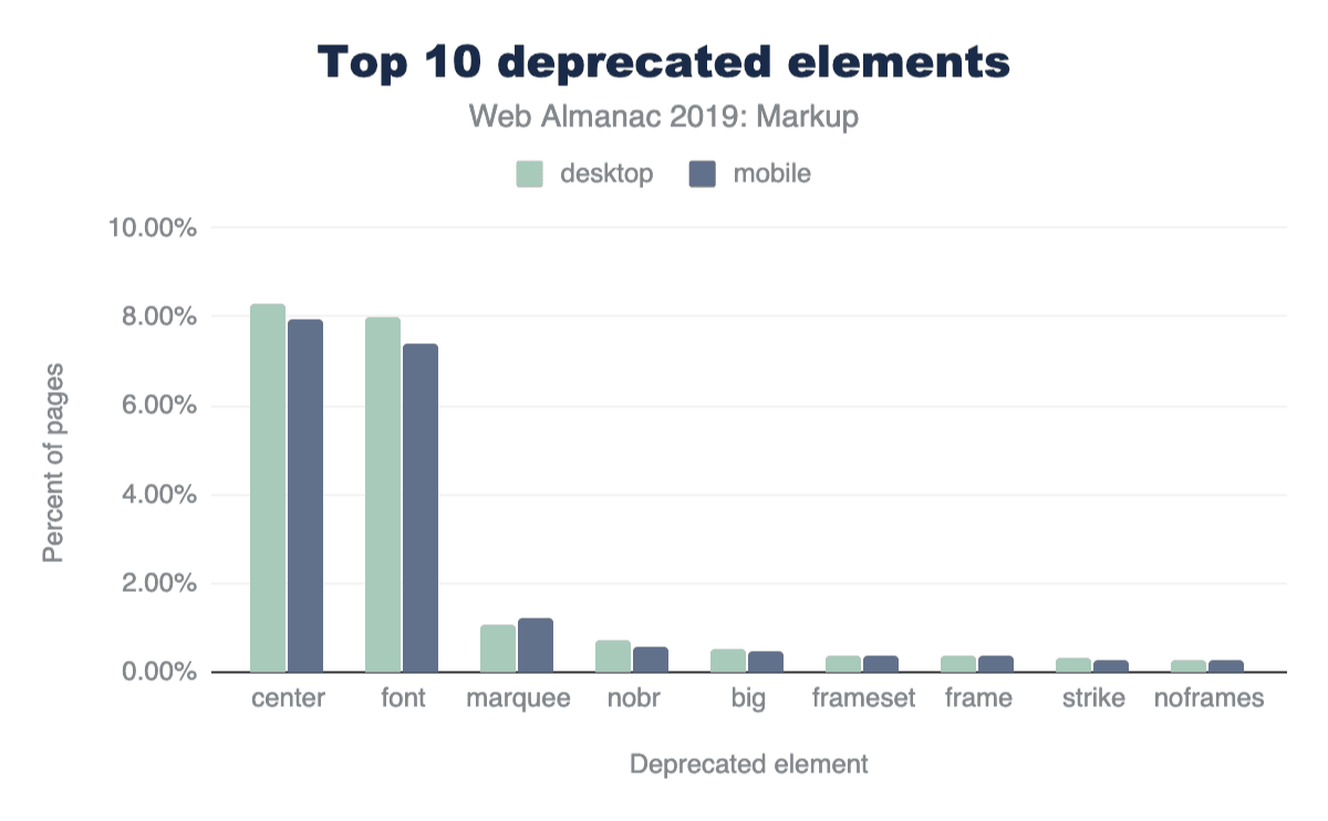 Additionally, 15% of desktop pages and 16% of mobile pages contain deprecated elements.