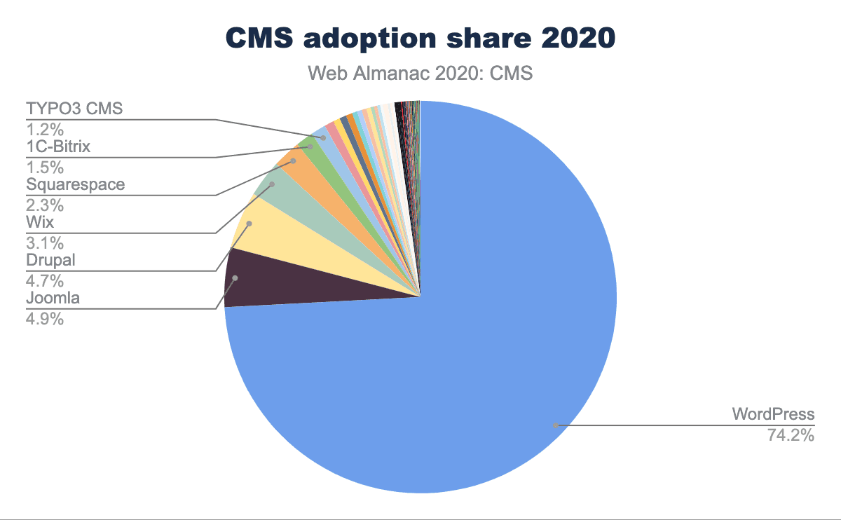 Whichever CMS used, it is in use because it solves a problem for the user or organization. It’s beyond our scope to explore why each CMS is chosen, but later we do explore why the most popular CMS, WordPress, is disproportionately chosen.