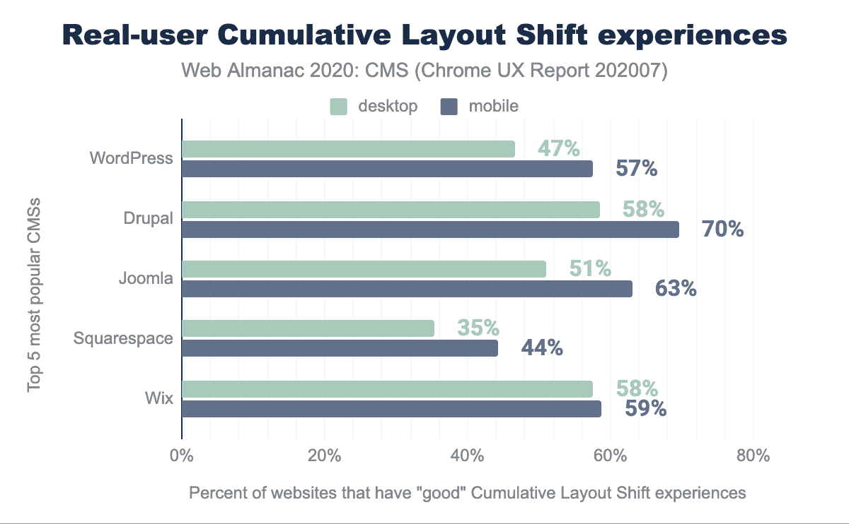 Even though we’d love to see CMSs performing much better here, there are still some positive takeaways from these results. For one, the fact that 61% of Drupal websites have good LCP is especially notable because it’s much better than the global distribution of 48% of websites having good LCP, according to the Chrome UX Report. For 1 in 3 or 4 WordPress websites to have good LCP is also kind of amazing, given the sheer magnitude of the number of WordPress websites. Wix does have some catching up to do, but it’s encouraging to see that Wix engineers are actively working on fixing performance issues, so this will be something to keep an eye on over the years.