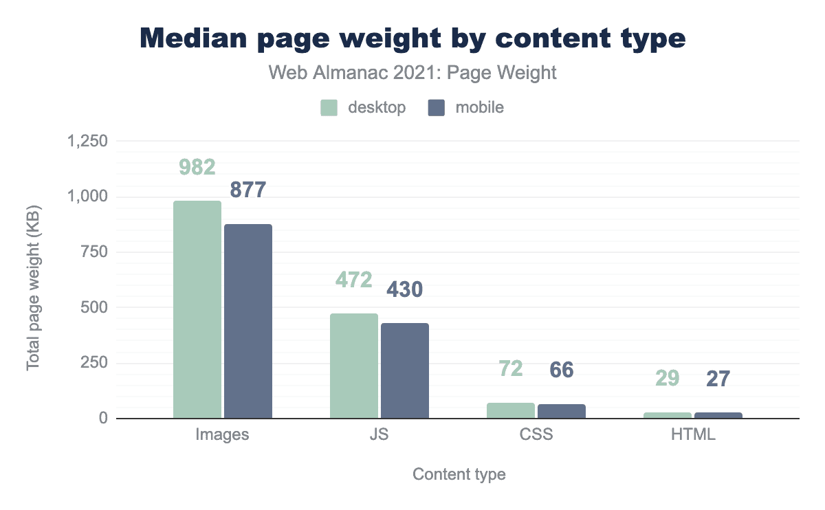 Looking at the page weight on both desktop and mobile devices, the difference is generally small between them despite the often-different capabilities of these devices: