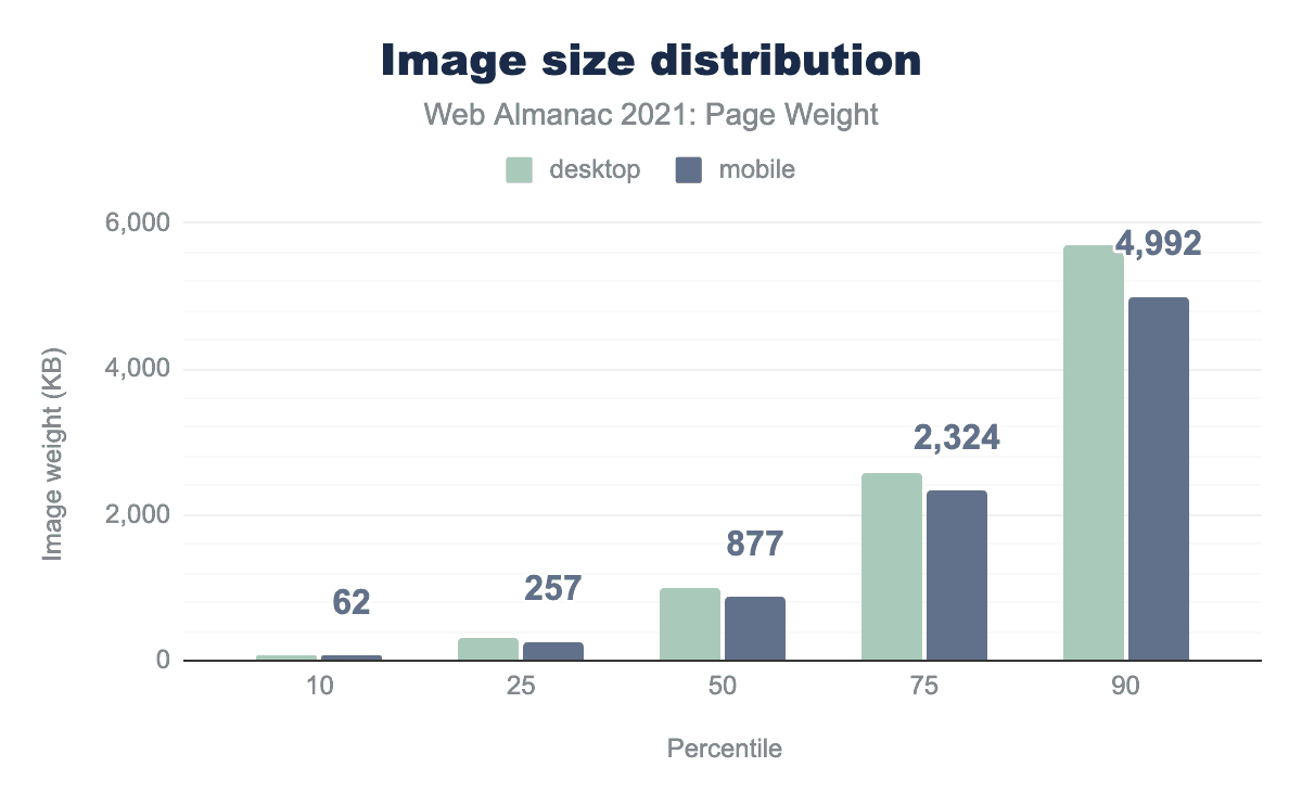 We are closing in on 6.9 MB of page weight on mobile and 8.1 MB on desktop at the 90th percentile.