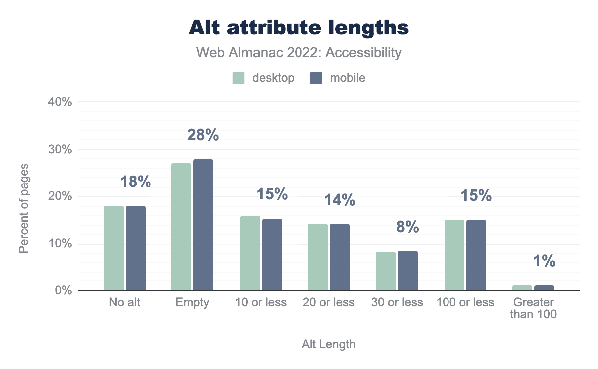 We found that 27% of alt text attributes in desktop and mobile websites were empty. An empty alt attribute is supposed to be used only when the image is presentational and should not be described by screen readers or other assistive technologies. However, most images on the web do add value to the content in the web page and hence should have a proper text description. We found that 15.3% have 10 or fewer characters, which would be a strangely short description for most images, indicating that information parity has not been achieved. Though it is possible that some of them might be used to provide labeling for a link, in which case it’s okay.