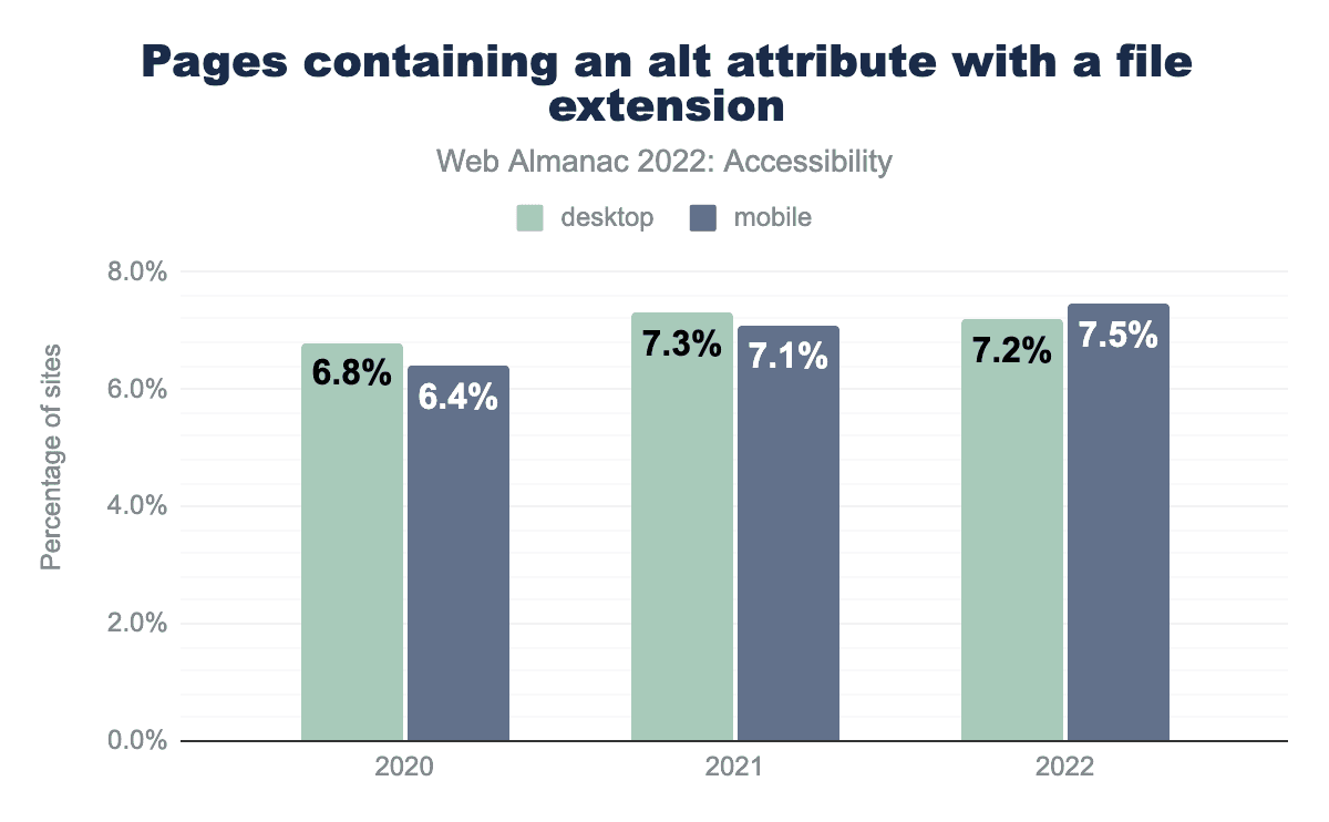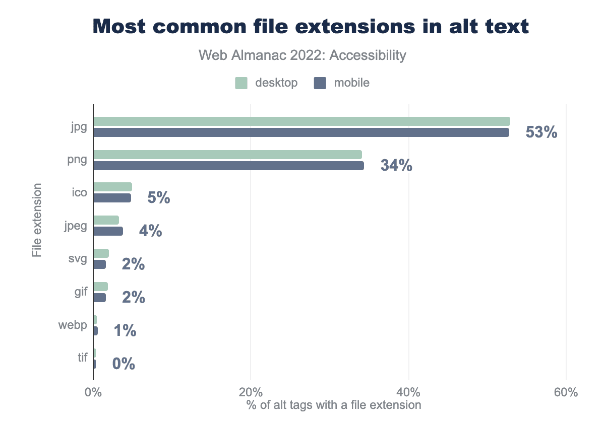 The text in the alt attribute depends on the context. If the image is decorative and doesn’t provide any meaningful information, then alt="" is ideal. However, if the image is crucial to the context of the page, then a proper text description is essential. If the image is a child of a link, then ideally the alt attribute should be used to label the link so the user knows where the link takes them. We found that 7.5% of mobile web pages and 7.2% of desktop pages with an alt attribute have a file extension assigned to that alt attribute. This probably means that the alt attribute just contains the image filename, which is likely not helpful at all, and should be avoided in every case.