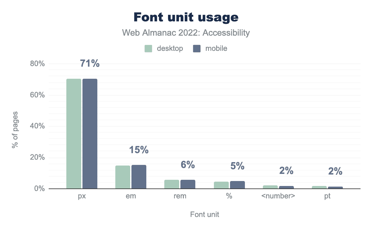 Another thing to keep in mind is the unit you choose for font size. We found that 71% of pages in desktop use px, and only 15% and 6% use em and rem respectively. So the percentage of px usage in desktop has increased by 2% compared to last year, while em usage has decreased by 2%. It’s considered wise to use relative units such as em or rem when it comes to font-size because if you use px it will not scale if the user explicitly choses a bigger or smaller default font size in the browser settings.