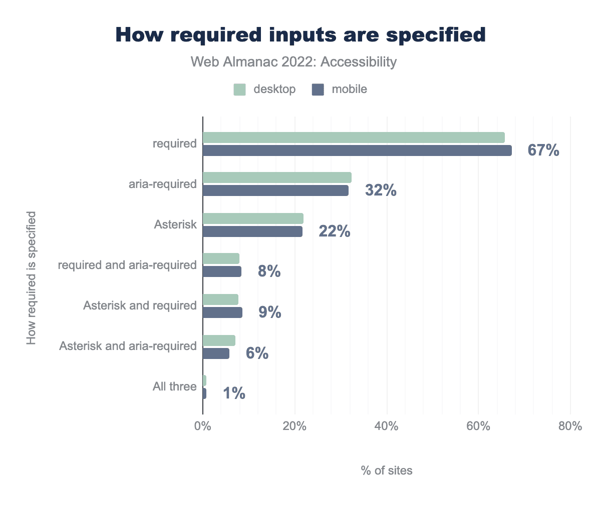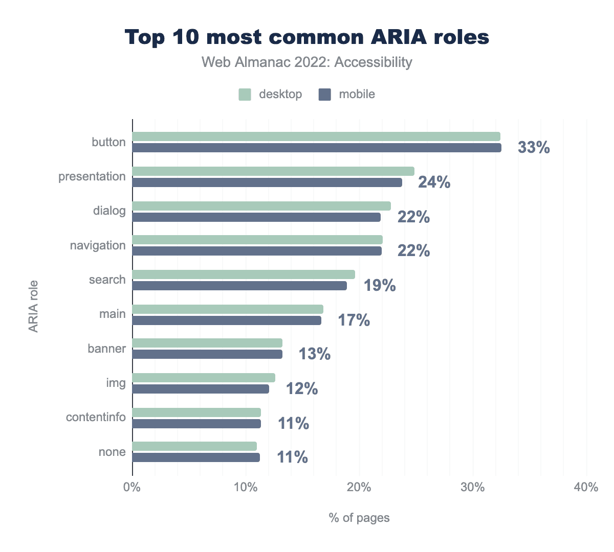 We found that 33% (up from 29% in 2021, and 25% in 2020) of desktop and mobile sites had home pages with at least one element with an explicitly assigned role="button". This increase in percentage is likely not good since this indicates that websites are either creating custom buttons using <div> or <span>, or are adding a redundant role to <button> elements. Both of these are bad practices and go against the first rule of ARIA. Following this rule, one should always use a native HTML element—in this case, <button>—when possible.