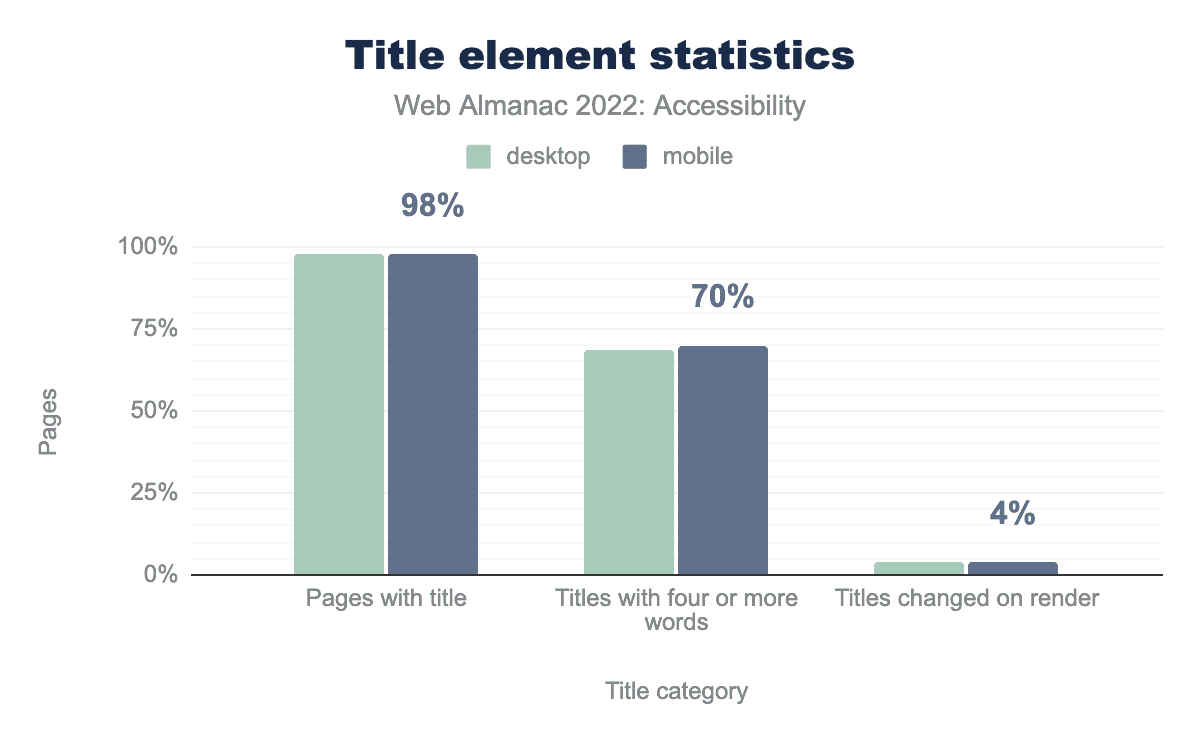 Though there are 98% of mobile websites which have a document title, only 70% have a title that is longer than four words. Since we only scan home pages of websites, it’s not possible for us to determine if the inner pages of the website use a more detailed text in the <title> tag that describes the page. A title should ideally have both the title of the website as well as a title giving context about the page in the website for better navigation.