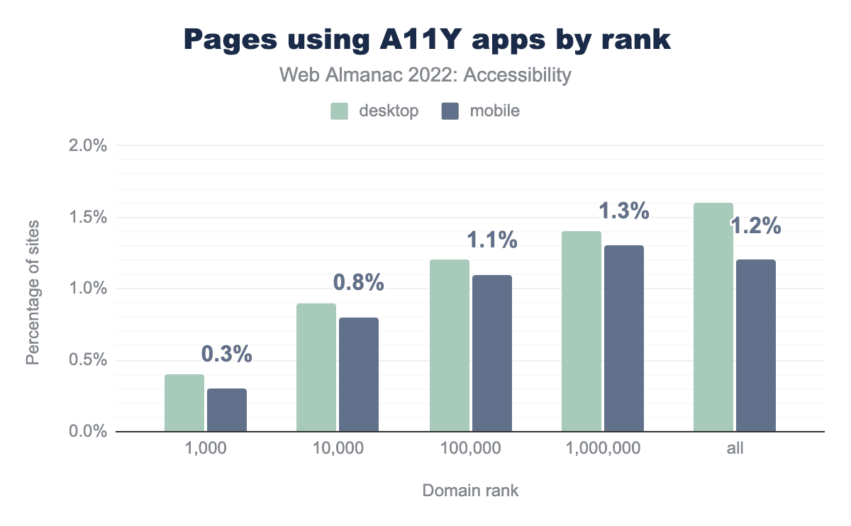 We found that 1.6% of desktop websites use one of 22 specific accessibility apps we could detect in 2022. This is a clear rise compared just under 1% in 2021.