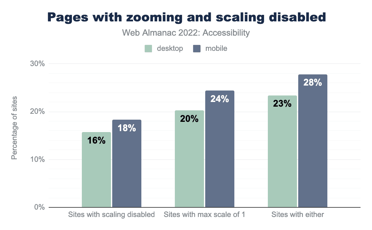 WCAG requires that text in a website can be resized up to at least 200%. We have found that 23% of desktop home pages and 28% of mobile home pages attempt to disable zoom.