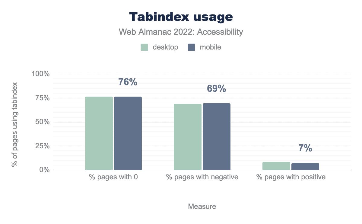 We found that 60% of mobile websites and 62% of desktop websites use tabindex. The tabindex attribute can be used for a few different purposes, which may or may not cause accessibility issues:
