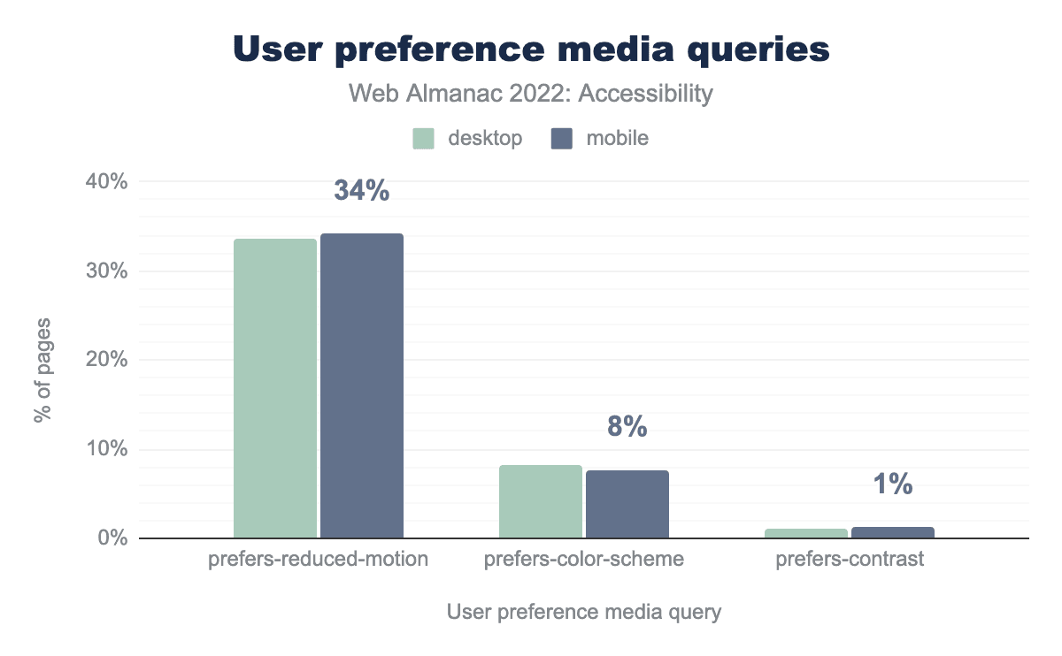 We found that 34% of mobile websites use prefers-reduced-motion. Websites that rely on motion can cause issues for people with vestibular disorders, so it is important to adapt or remove those animations with the prefers-reduced-motion media query. There are many great resources related to designing accessible animation.
