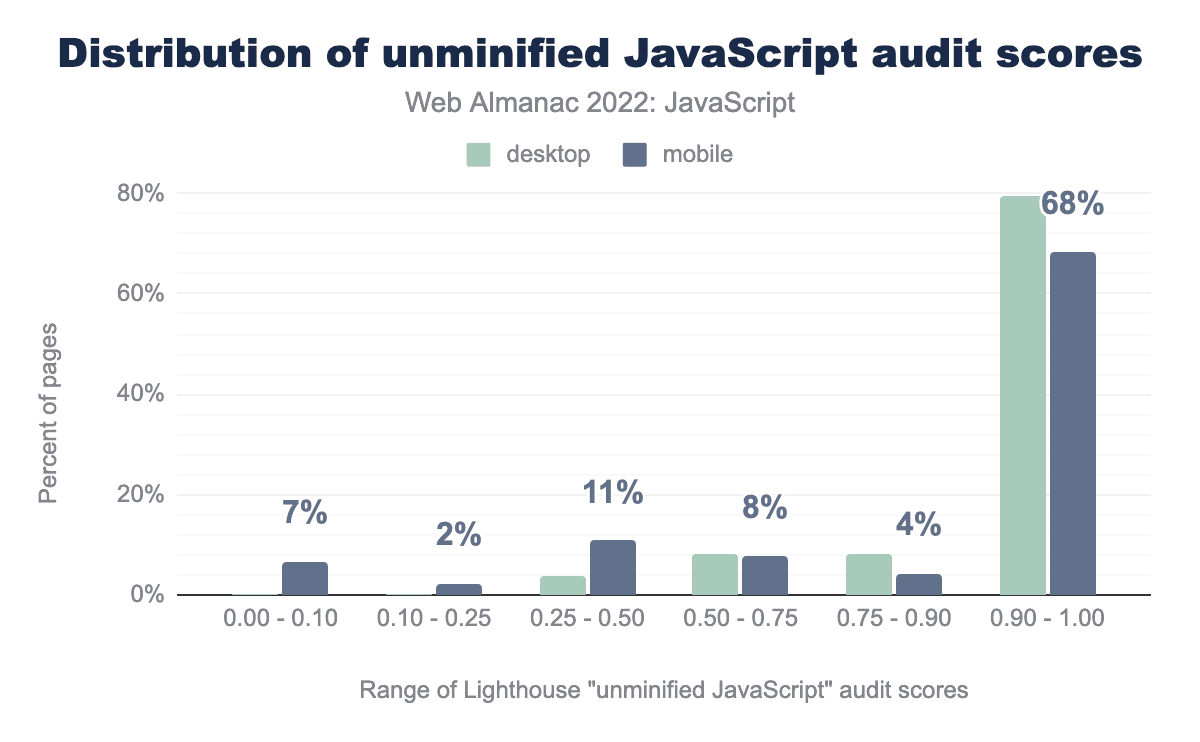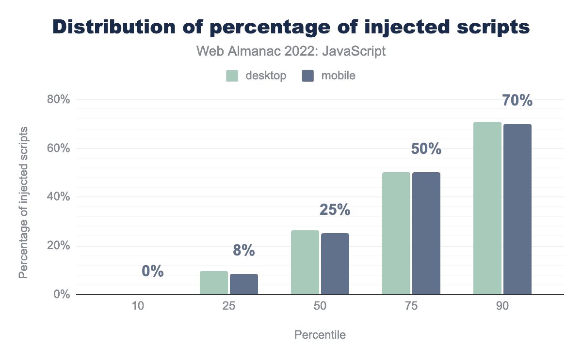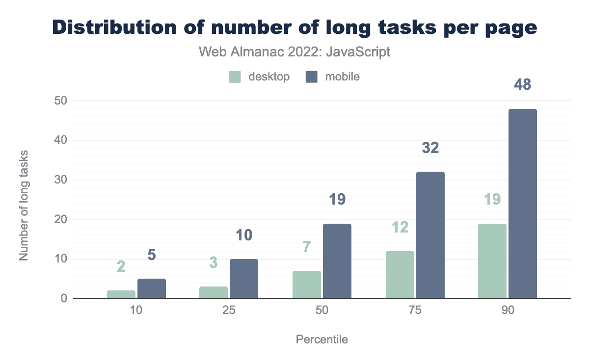 As was the case last year, this year marks yet another increase in the amount of JavaScript shipped to browsers. From 2021 to 2022, an increase of 8% for mobile devices was observed, whereas desktop devices saw an increase of 10%. While this increase is less steep than in previous years, it’s nonetheless the continuation of a concerning trend. While device capabilities continue to improve, not every one is running the latest device. The fact remains that more JavaScript equates to more strain on a device’s resources.