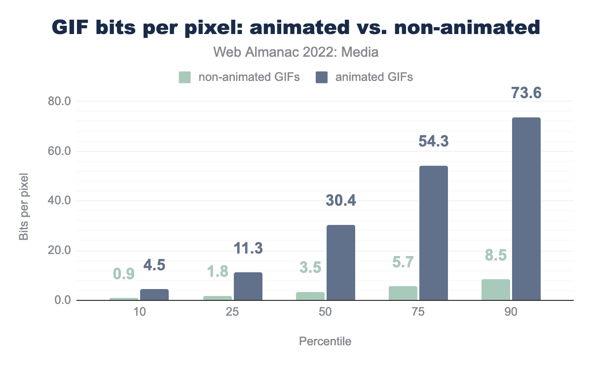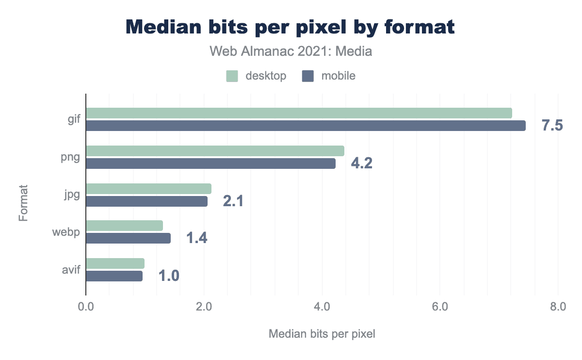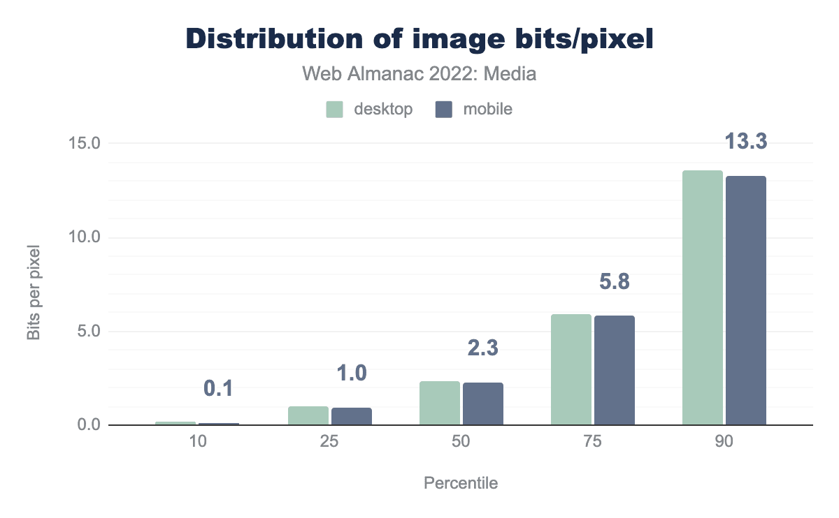 Bytes and pixel counts are interesting on their own, but to get a sense of how compressed the web’s image data is, we need to put bytes and pixels together to calculate bits per pixel. Doing this allows us to make apples-to-apples comparisons of the information density of images, even if those images have different resolutions.