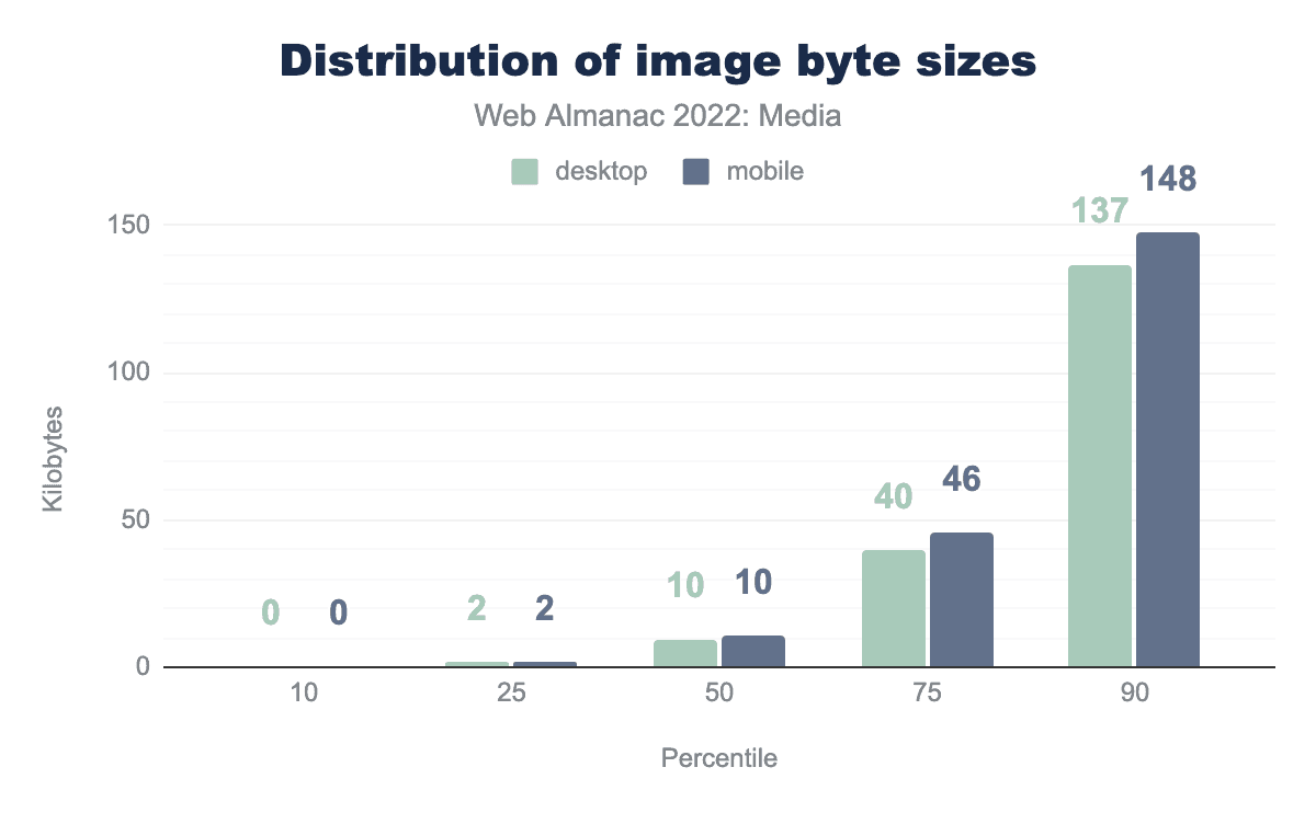 Images account for a huge portion of the typical website’s page weight. We see from the Page Weight chapter that the median website’s total weight in June of 2021 was 2,019 kilobytes (on mobile), and 881 of those kilobytes were images. That’s more than HTML (30 KB), CSS (72 KB), JavaScript (461 KB) and fonts (97 KB) combined.