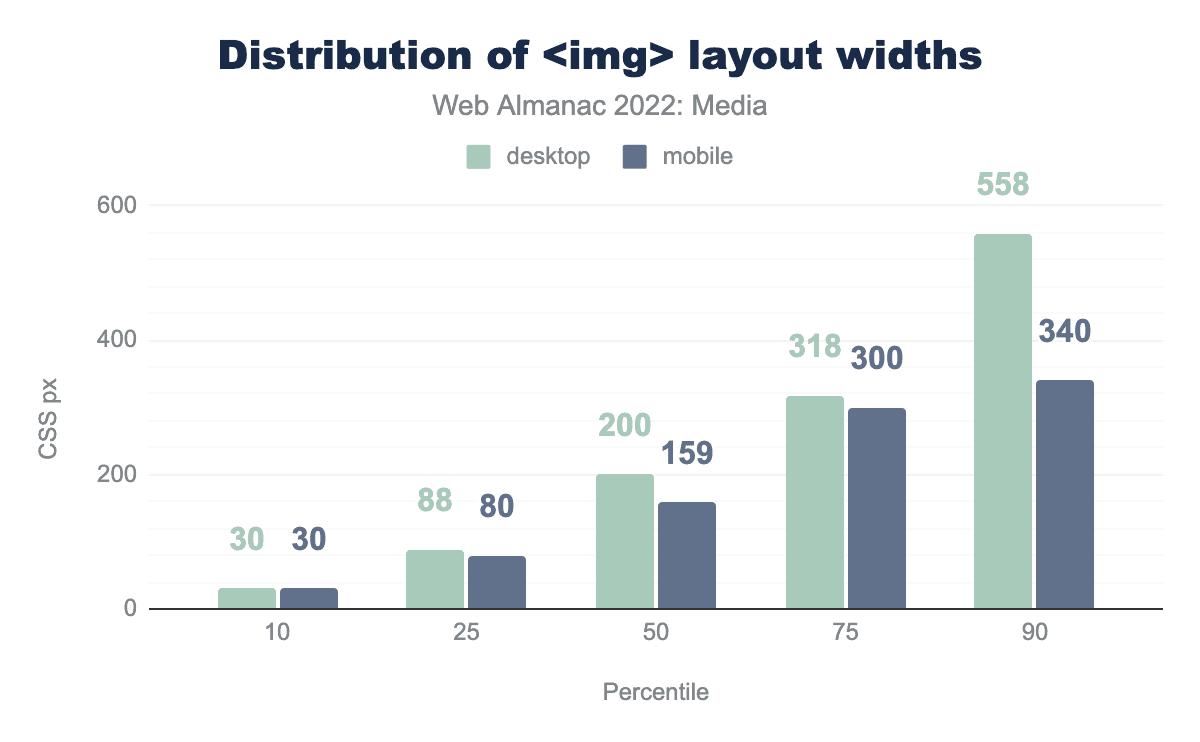 We estimate that one-quarter of desktop pages are loading more than 83 KB of extra image data, based purely on bad sizes attributes. That is to say: A better, smaller resource is there for the picking in the srcset, but because the sizes attribute is so erroneous, the browser doesn’t pick it. Additionally, 10% of desktop pages that use sizes load more than a half-megabyte of excess image data because of bad sizes attributes!