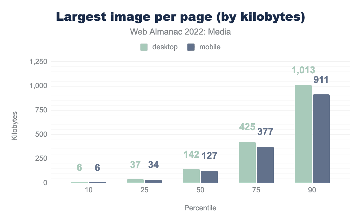 Most pages have at least one image over 100 KB, and the top 10% of pages have at least one image that weighs almost 1 MB or more.