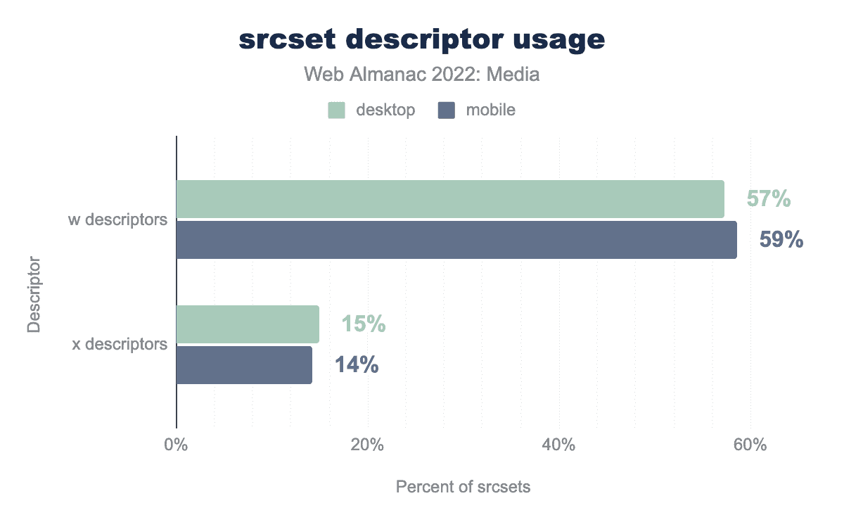 One-third of pages use srcset, but two-thirds don’t. Given the prevalence of fluid grids within responsive designs in 2022, I suspect there are a lot of pages that aren’t using srcset that should be.