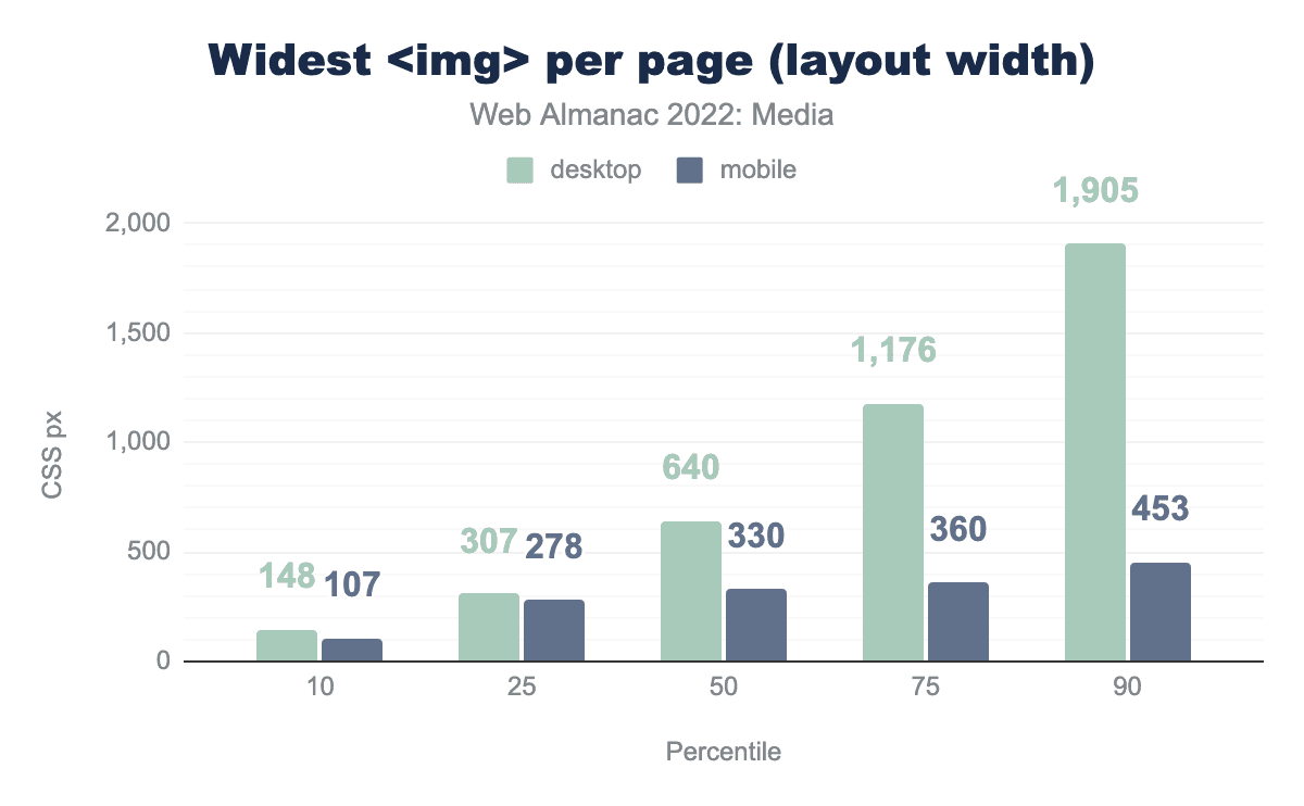 It’s interesting to contrast this with the desktop layout widths, which don’t top out at all. They just keep growing. I find it surprising that more than 10% of pages on desktop included an image that was wider than the crawler’s 1360px viewport, presumably triggering horizontal scrollbars.