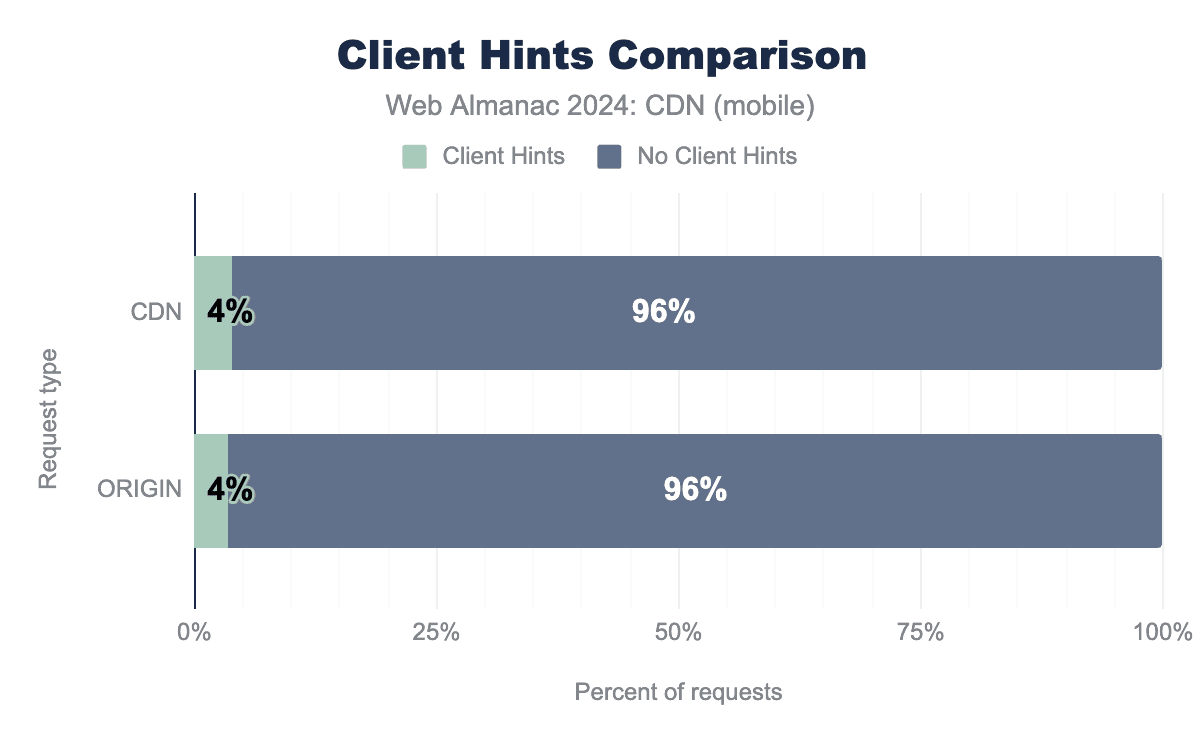 In 2022, Client Hints adoption was at less than 1% for mobile requests. While the 2024 result was an increase with less than 4% of the requests for mobile devices indicating the presence of Client Hints, adoption of this capability remains low relative to the overall amount of requests observed. Though not explored in this year’s chapter, if Client Hints adoption continues to grow we may in future chapters measure how CDNs are using the Accept-CH header to vary on for caching purposes and a more personalized experience.