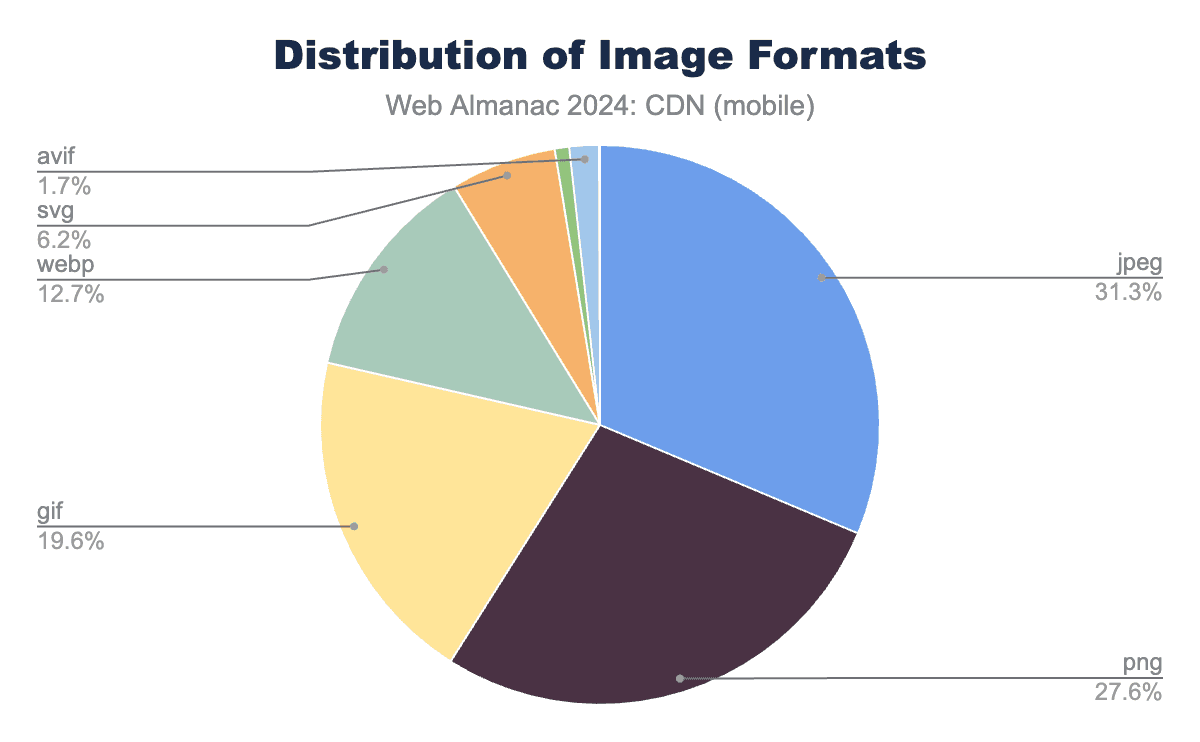As of 2024, data reveals that while traditional formats like JPEG and PNG still dominate, there’s a clear trend towards adopting more efficient and mobile-friendly formats like WebP and SVG. The mobile ecosystem generally shows higher numbers for most formats, reflecting the growing importance of mobile web usage. The presence of newer formats like AVIF suggests an industry push towards more efficient image delivery, which is crucial for improving web performance and user experience across all devices.