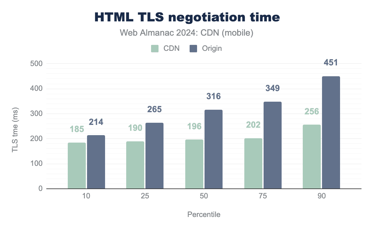 Mobile devices show a similar pattern, with CDN performing better than Origin servers, but the overall negotiation times are higher compared to desktop. The median TLS negotiation time for mobile CDN is 196 milliseconds, while for Origin servers it’s 316 milliseconds. At the 90th percentile, mobile CDN takes 256 milliseconds, whereas Origin servers require 451 milliseconds.
