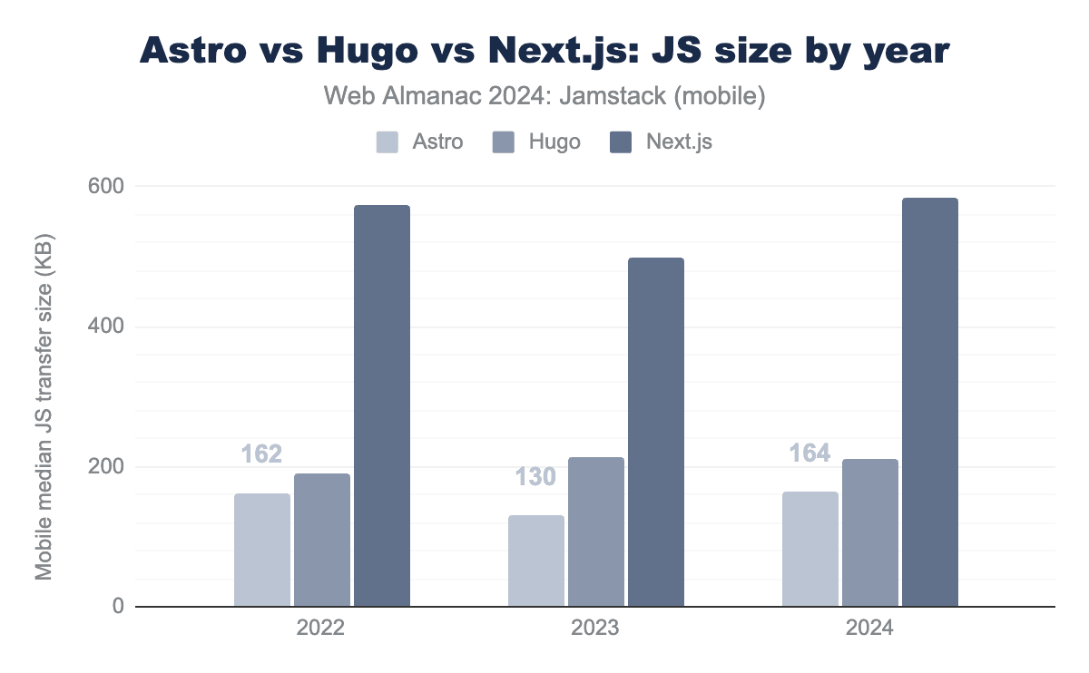 Focusing on the three standout Static Site Generators in the Prerendered category—Astro, Hugo, and Next.js—gives us another lens to analyze page weight. Note: this analysis only includes sites in the Prerendered category to keep the comparison fair.