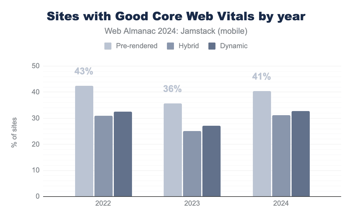 Prerendering typically results in a faster Time to First Byte (TTFB), which will naturally improve LCP: the faster the browser receives the HTML, the sooner it can start fetching assets and render the page. These sites also tend to receive more attention to details like CLS, as they are often handcrafted by developers. Hybrid has a heavy use of JavaScript frameworks and largest JavaScript payloads, which likely explains it having the lowest percentage of Good Core Web Vitals.