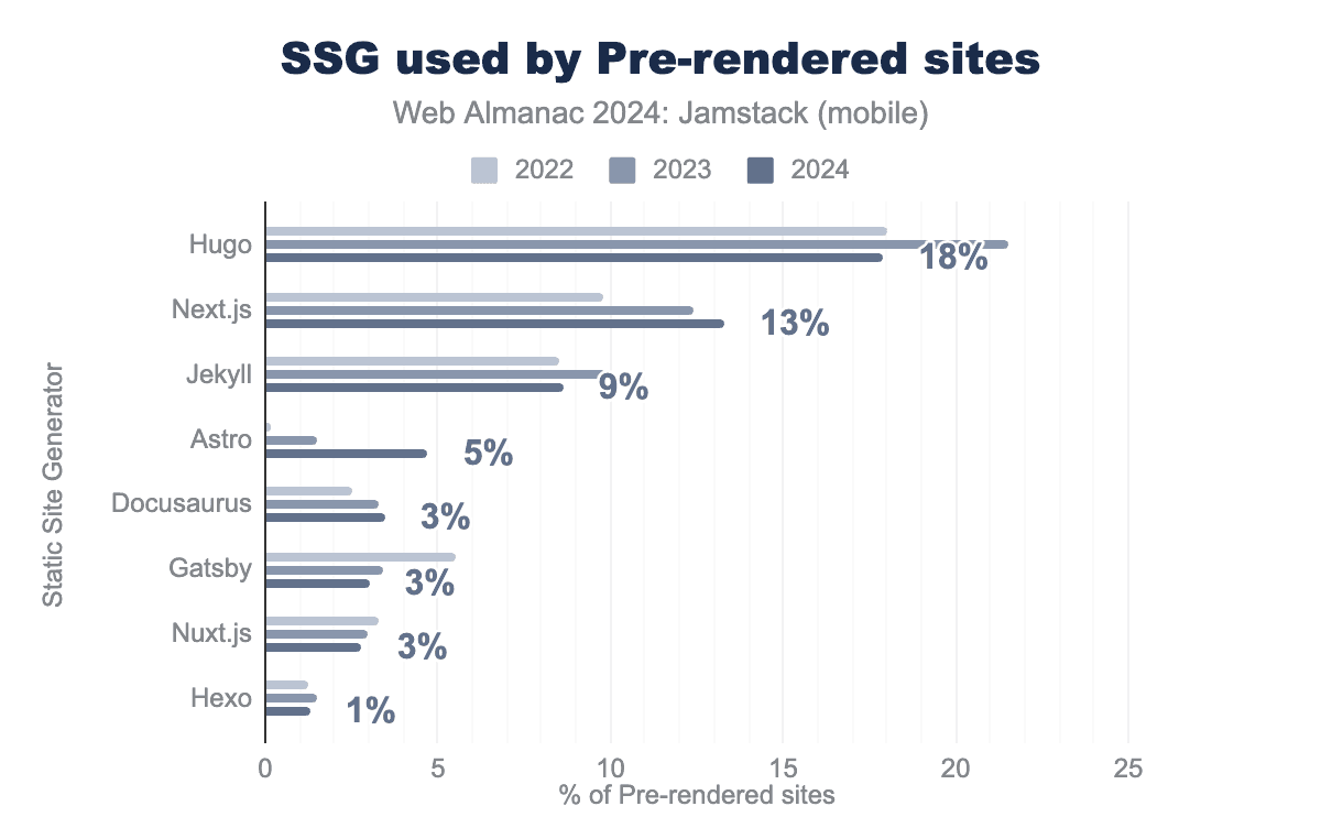 Hugo continues to lead as the top Static Site Generator in the Prerendering space, with Next.js gaining ground. Astro saw the largest growth of any Prerendering framework in 2024, an impressive feat considering it’s one of the newest frameworks in this space.