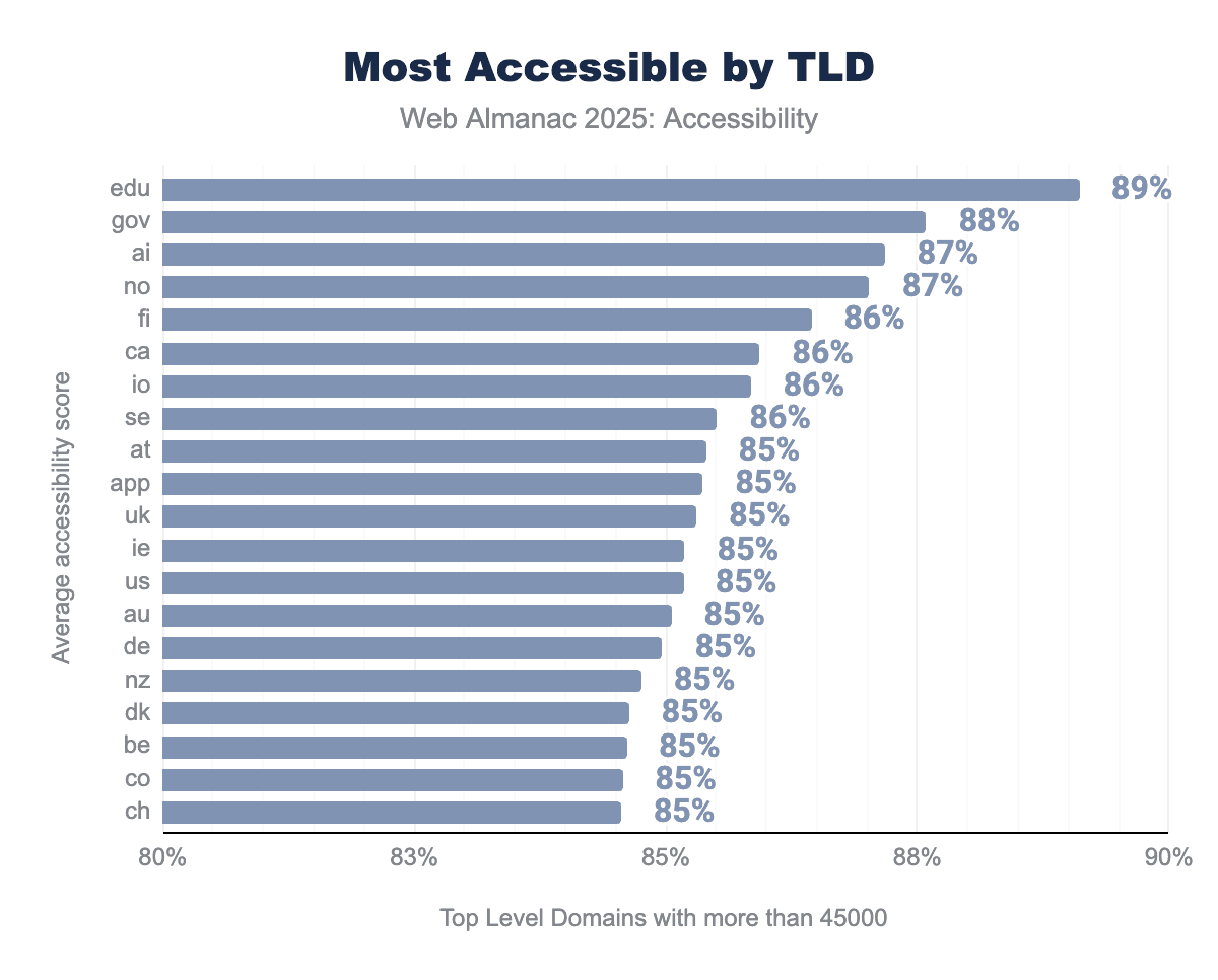 We noticed a notable trend emerging in 2025. .ai domains appeared for the first time in accessibility rankings, now outperforming all TLDs except .edu and .gov. This likely reflects the growing adoption of AI-related businesses, many of which prioritize modern development practices, including accessibility.