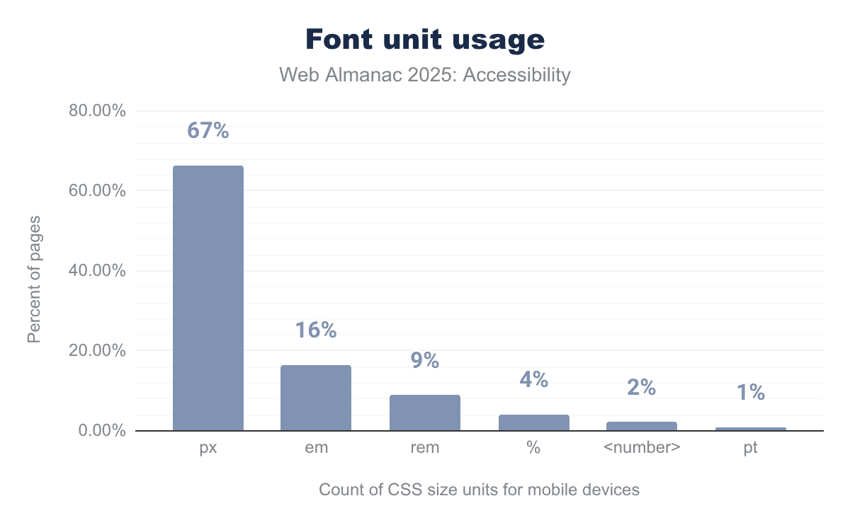 px is used for font sizes on 67% of desktop, em on 16%, rem on 9%, percentages on 4%, <number> on 2%, and finally pt on 1% of websites tested.Font size units directly affect how text can respond to user preferences. Relative units, such as em and rem, let text to scale predictably with browser settings. In 2025, the use of em on mobile sites increased by 2%, improving user experiences for those who adjust font sizes to increase readability. Otherwise, font size unit usage stays largely the same as last year.