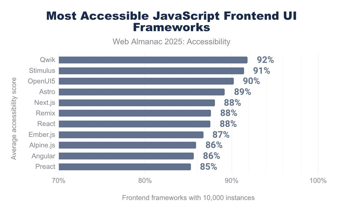 In 2025, OpenUI5 has risen in accessibility rankings, while frameworks that led in 2024 (Stimulus, Remix, and Qwik) have shifted positions. Remix appears in both UI and meta-framework categories, but has declined in rankings in 2025, allowing other frameworks to advance. This volatility may reflect sample size changes or real improvements in competing frameworks. The fact that all Remix functionality was integrated right into the next version of React Router, making Remix redundant as a React framework, can also have an impact on rankings.