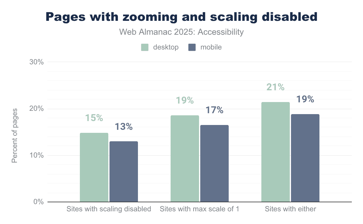 The number of sites that disable zooming or scaling continues to drop. In 2025, only 19% of mobile sites and 21% of desktop sites restrict scaling, either by using user-scalable=no or setting a restrictive maximum scale. That’s a 1–2% improvement over 2024, showing slow but steady progress.